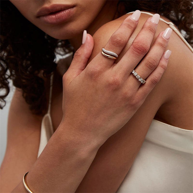 - Dual-Layer Design: Features two distinct, contoured bands that merge into one piece: a smooth, high-polish curve and a sparkling pave-set curve.
