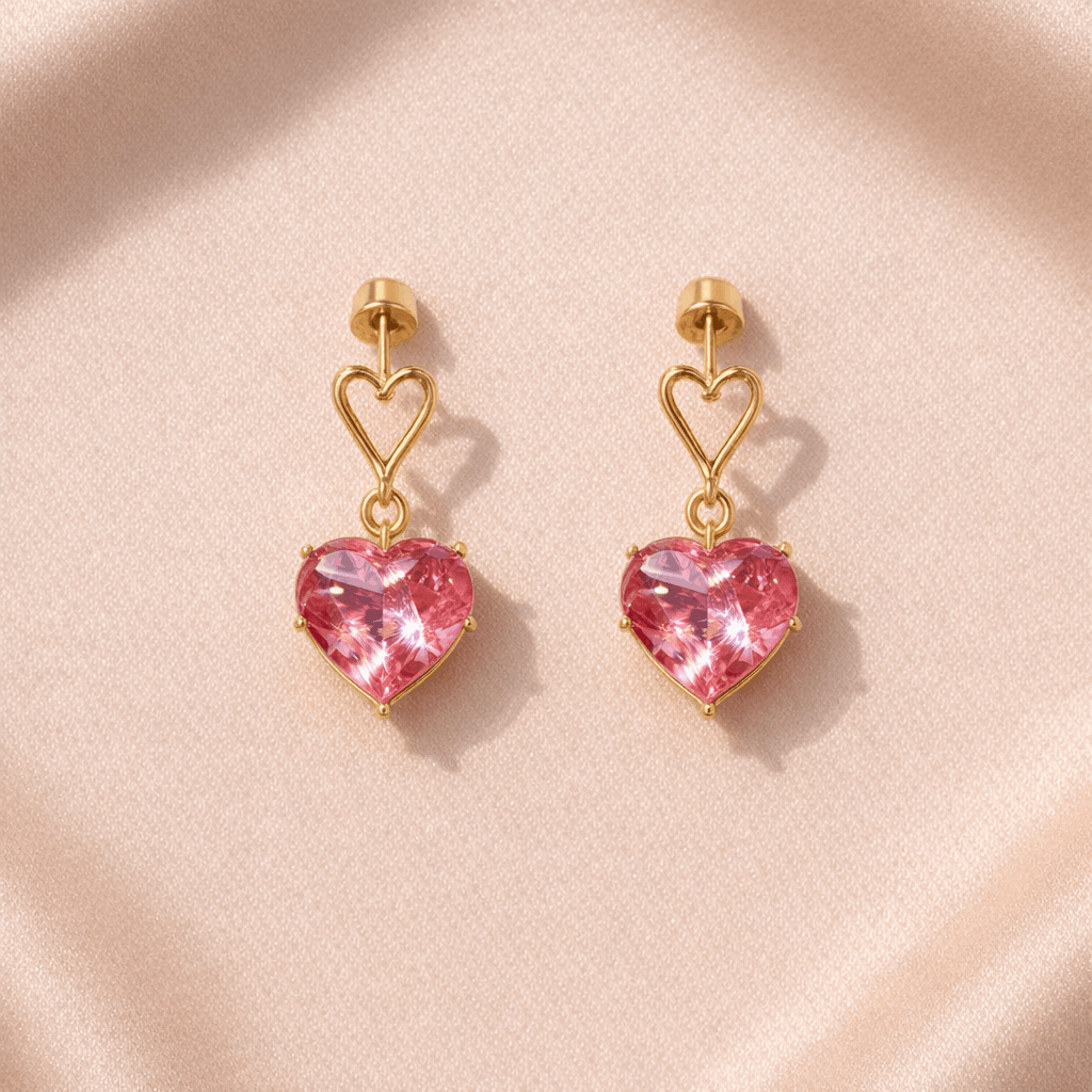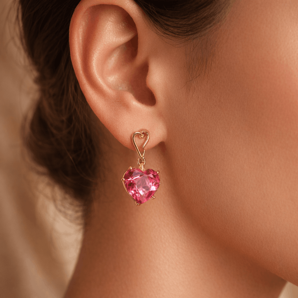 Heart-on-Heart Design: A unique combination of a structural gold heart stud and a vivid pink crystal drop for a layered, romantic look.