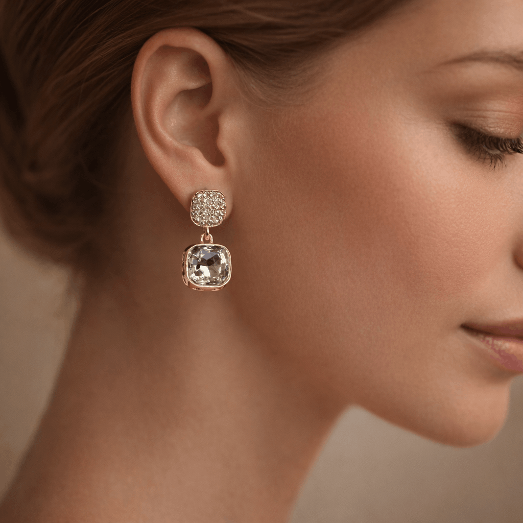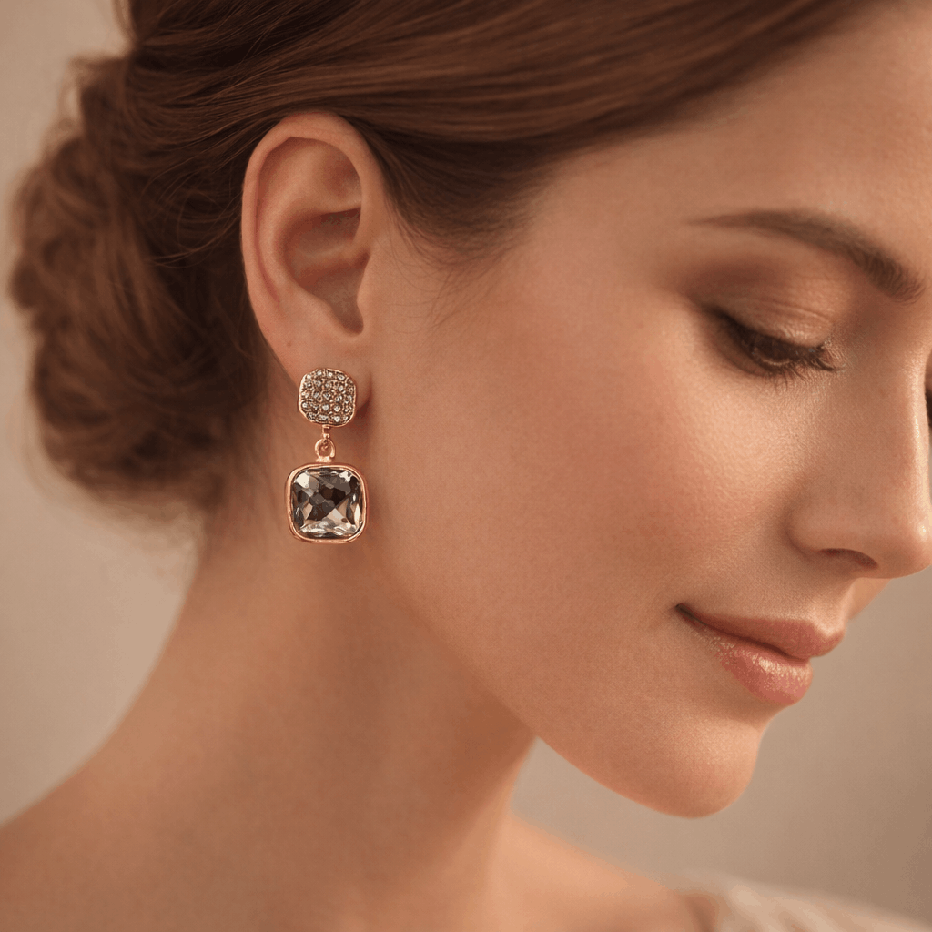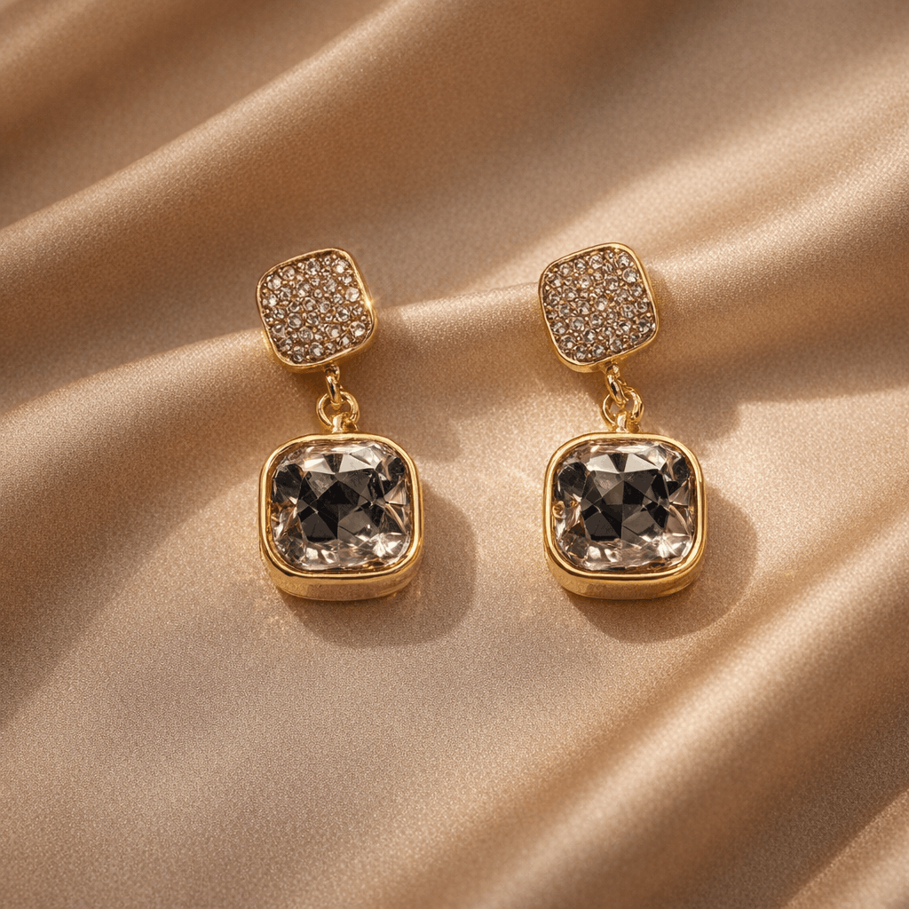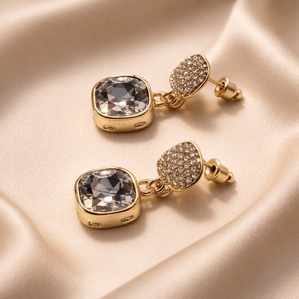 These gold drop earrings for women feature a refined double-square design, with a top stud encrusted in delicate micro-crystals and a suspended cushion-cut champagne crystal stone that captures and reflects light beautifully. The soft neutral tone of the crystal adds a luxurious warmth, making these earrings versatile for both day and evening wear.