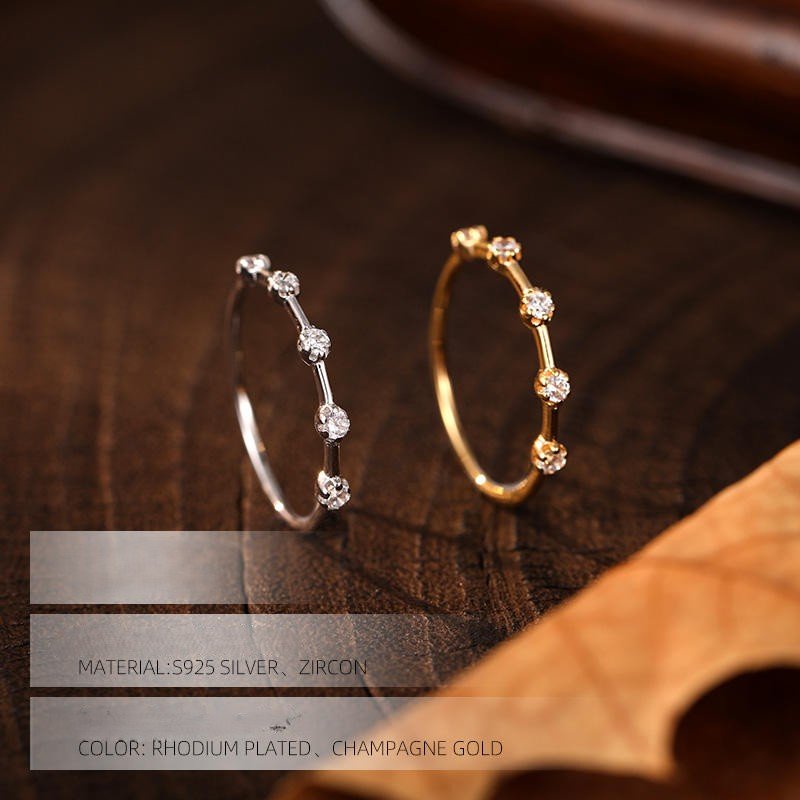 This dainty ring is the essential piece your collection is missing. Featuring five beautifully set, brilliant Zircon (CZ) stones spaced evenly across the slim band, it offers a refined twinkle without being overwhelming. Perfect for minimalist style, stacking, or wearing as a simple wedding band. Made with genuine 925 Sterling Silver, and available in your choice of bright Silver-Tone or luxurious Champagne Gold-Tone, this ring provides comfortable, long-lasting luxury for everyday wear.
