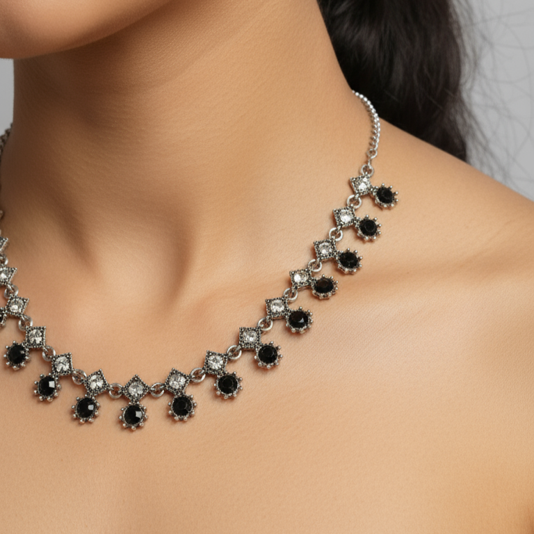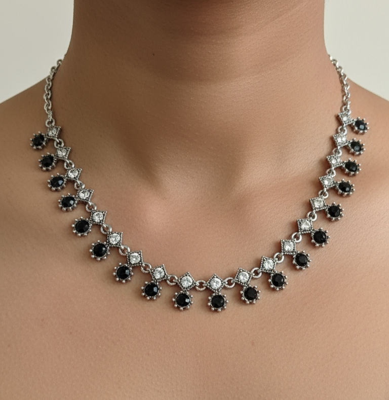 This exquisite set features a beautifully crafted silver necklace adorned with elegant black stones, paired perfectly with matching earrings. Designed for special occasions and functions, this jewelry exudes sophistication and charm. The delicate silver work combined with the bold black stones creates a striking contrast, making it an ideal accessory for enhancing traditional and contemporary looks alike. Perfect for adding a touch of glamour to any festive or formal outfit.
