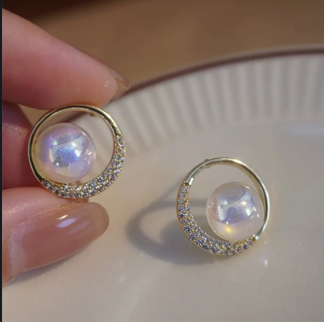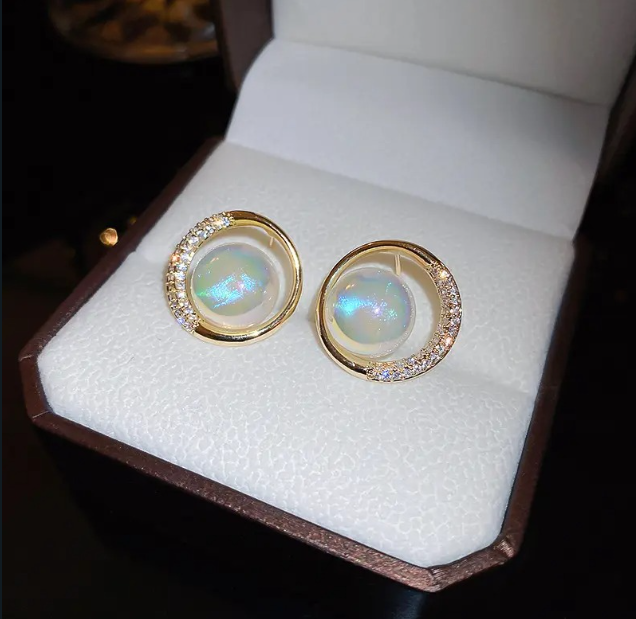 - These premium stud earrings feature a glowing, ethereal pearl-like center stone hugged by a crescent of brilliant zircon diamonds. The sophisticated design offers a delicate sparkle that is perfect for professional settings, date nights, or as an exquisite bridesmaid gift. Comes beautifully presented in a velvet box.