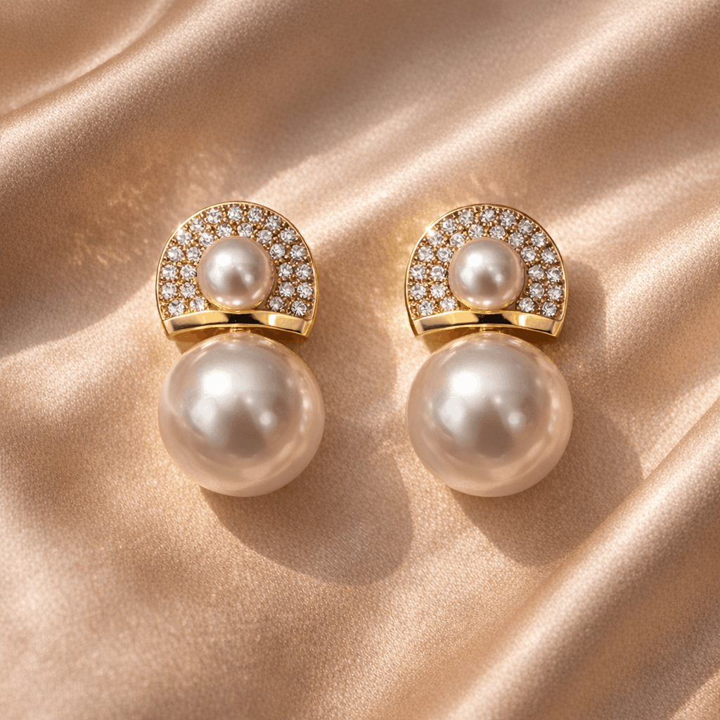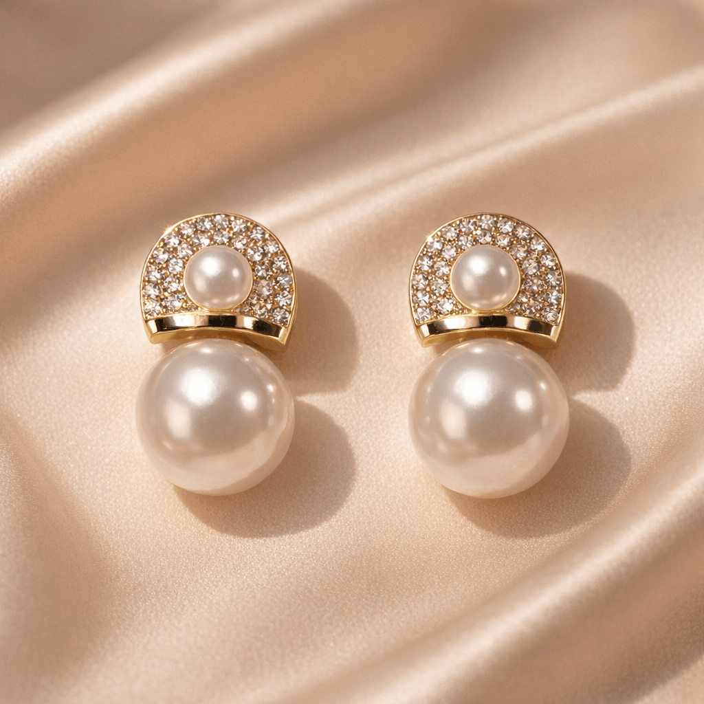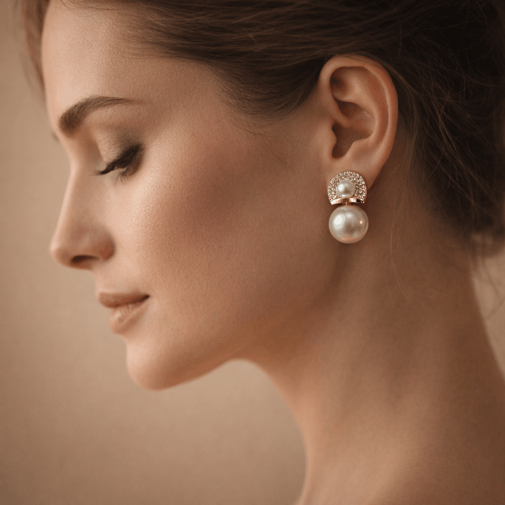 Designed with a stunning dual-pearl composition, these pearl drop earrings for women feature a beautifully set upper pearl surrounded by a shimmering crystal halo, paired with a larger luminous pearl drop for a bold yet graceful finish. The gold-toned structure enhances the richness, making these earrings ideal for wedding jewelry, party wear earrings, and premium everyday luxury styling.