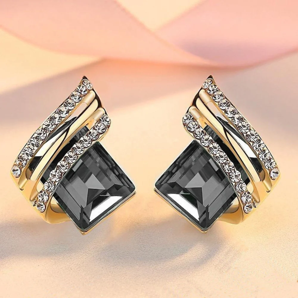 Featuring a striking black square stone set in a polished gold finish, these earrings are enhanced with layered gold detailing and shimmering crystal accents that add depth and brilliance. The geometric design gives a contemporary, high-end look, making them perfect for both casual styling and special occasions.