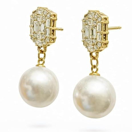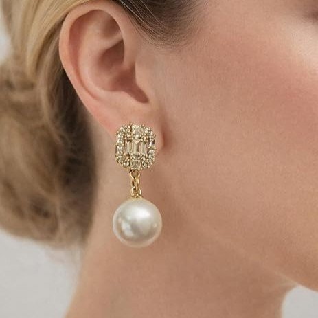 These gold pearl drop earrings for women feature a beautifully structured square stud, intricately set with baguette and round-cut crystals, forming a radiant, high-end finish. Suspended below is a smooth, lustrous round pearl drop, adding a touch of softness and sophistication to the overall design.