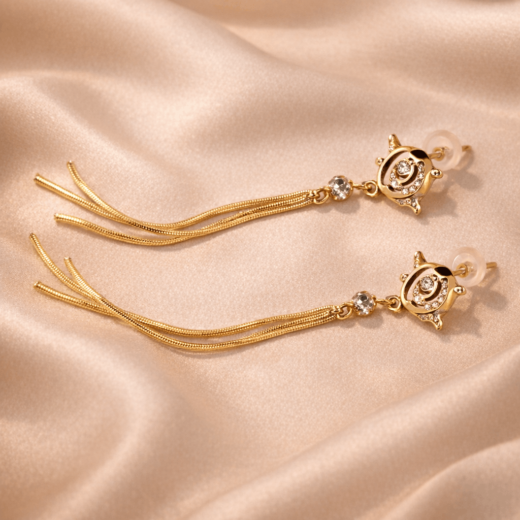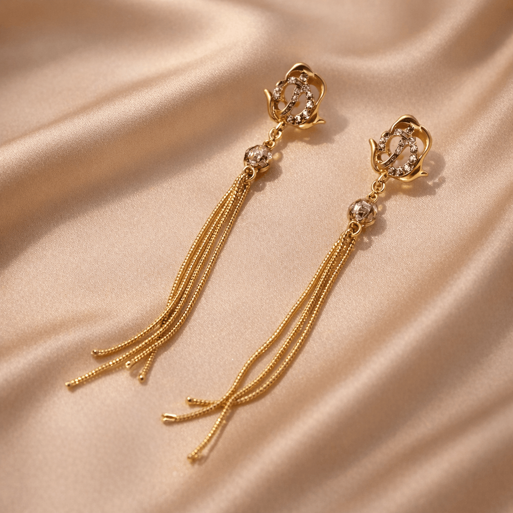 Featuring a delicately sculpted rose-inspired stud embellished with fine crystals, these gold tassel earrings bring together romance and modern luxury. The design flows into a shimmering connector stone, leading to multiple fine chain tassels that create graceful movement and a fluid silhouette.