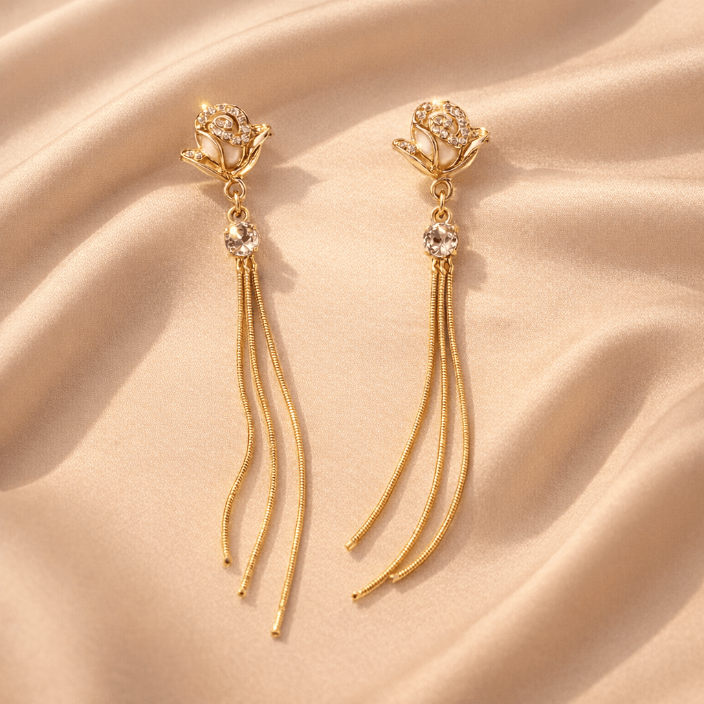 Introducing the Celira Roséva Cascade Tassel Drops, a stunning pair of rose design drop earrings crafted for women who embrace elegance with a statement.