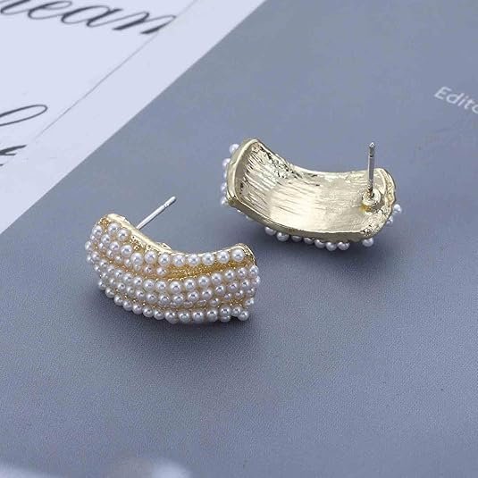 These stunning pearl earrings for women feature multiple rows of finely detailed pearls arranged in a curved gold structure, creating a rich and sophisticated look. The unique ear-cuff style adds depth and dimension, making these statement pearl earrings perfect for weddings, festive occasions, and party wear.