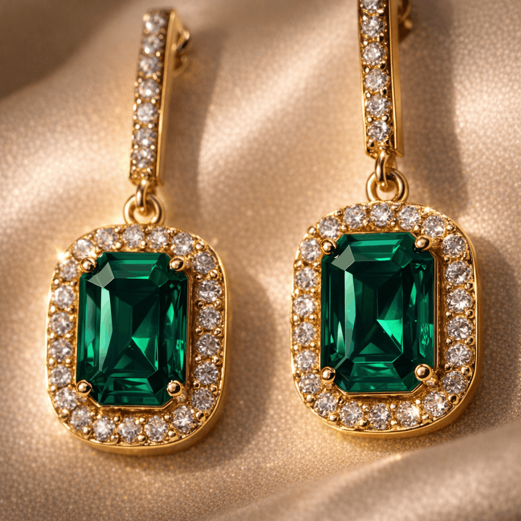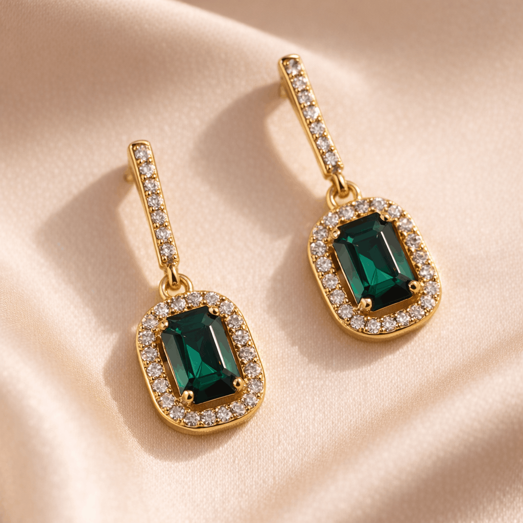 The Emerald Halo Drops feature a deep, forest-green emerald-cut stone, perfectly framed by a brilliant halo of micro-pavé crystals. Suspended from a slender, crystal-encrusted gold-tone bar, these earrings are the ultimate statement of “old money” elegance and refined taste.