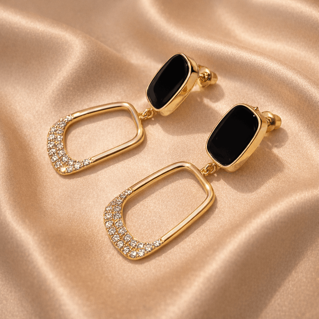 The Midnight Halo Drop Earrings feature a striking black onyx-style rectangular stud paired with an elongated, geometric drop pavé-set with shimmering crystals. These earrings are the epitome of high-fashion luxury, designed for those who want to make a sophisticated statement without saying a word.