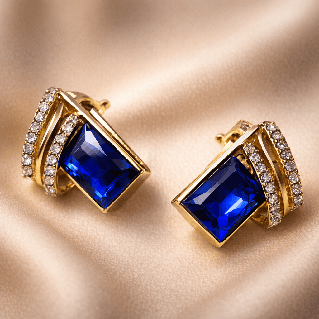 The Royal Azure Architectural Studs feature a mesmerizing, emerald-cut cobalt blue stone framed by a unique, curved multi-row setting. These earrings embody a “modern royal” aesthetic, perfect for the trendsetting entrepreneur who wants to stand out with minimalist yet luxurious jewelry.